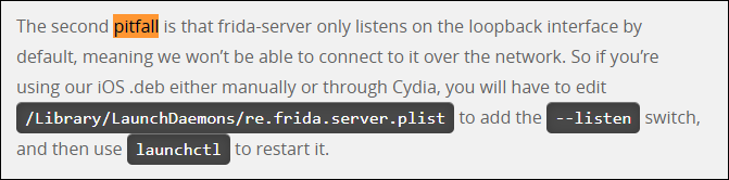 remote 모드로 구동하려면 "/Library/LaunchDaemons/re.frida.server.plist" 파일에 옵션 사항을 명시하고 launchctl 명령어로 재시작하라고 합니다.