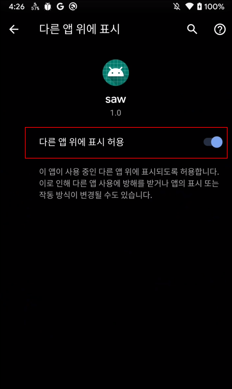 앱 권한 설정 항목으로 들어가서 "다른 앱 위에 표시 허용" 을 체크해줍니다.