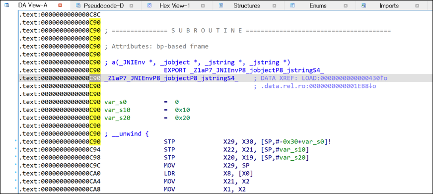 "com.stego.saw.MainActivity.a" 메서드는 libdefault.so 라이브러리의 offset 0xc90 에 위치한 함수와 매핑되고 있습니다.