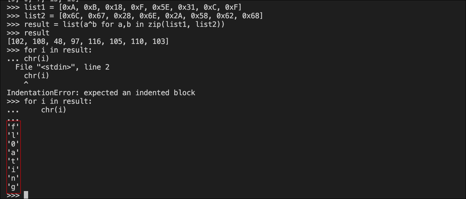 [0xA, 0xB, 0x18, 0xF, 0x5E, 0x31, 0xC, 0xF] ^ [내가 입력한 문자열] == [0x6C, 0x67, 0x28, 0x6E, 0x2A, 0x58, 0x62, 0x68] 이 되어야 합니다.