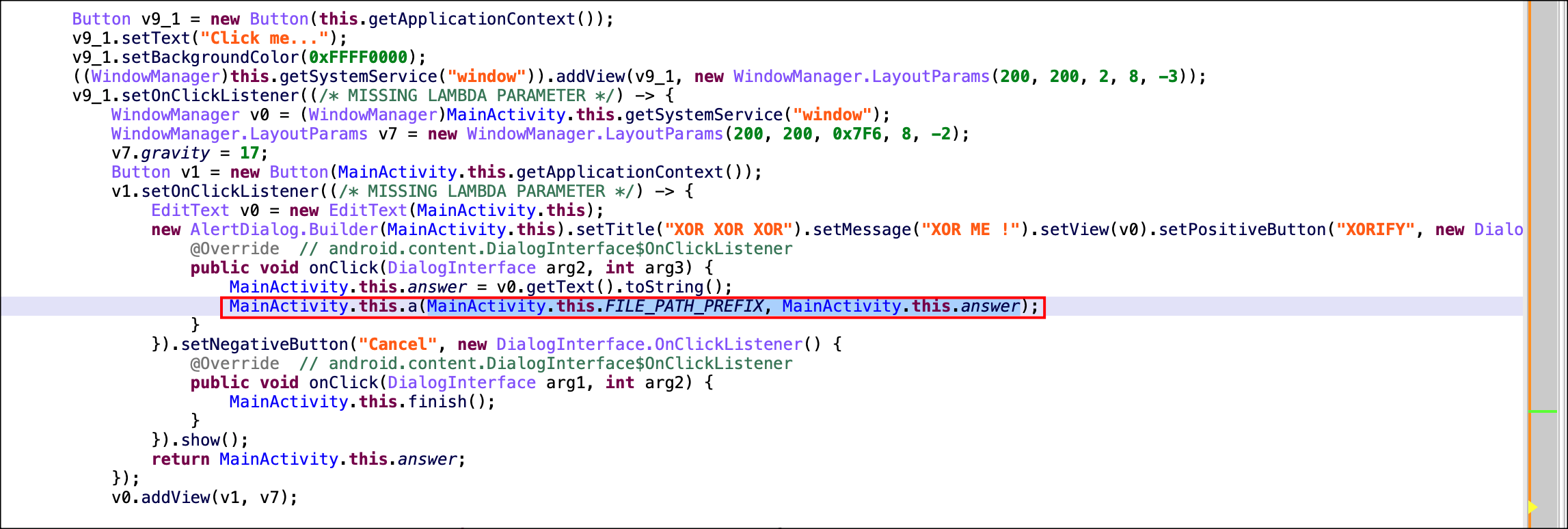 소스코드에 의하면 알람창에 아무값이나 입력하고 XORIFY 터치하면 네이티브 메서드 "a" 에 "FILE_PATH_PREFIX" 와 함께 입력값이 전달되는 로직입니다.